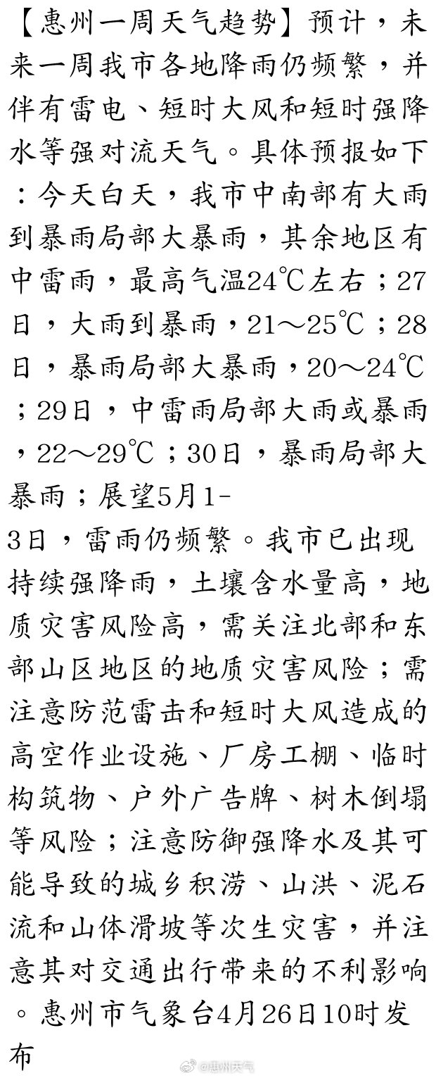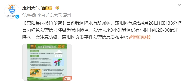 【惠陽暴雨橙色預(yù)警】目前我區(qū)降水有所減弱,惠陽區(qū)氣象臺4月26日10時33分將暴雨紅色預(yù)警信號降級為暴雨橙色。預(yù)計未來3小時我區(qū)仍有小時雨強20-30毫米降水,需注意防御。惠陽區(qū)突發(fā)事件預(yù)警信息發(fā)布中心