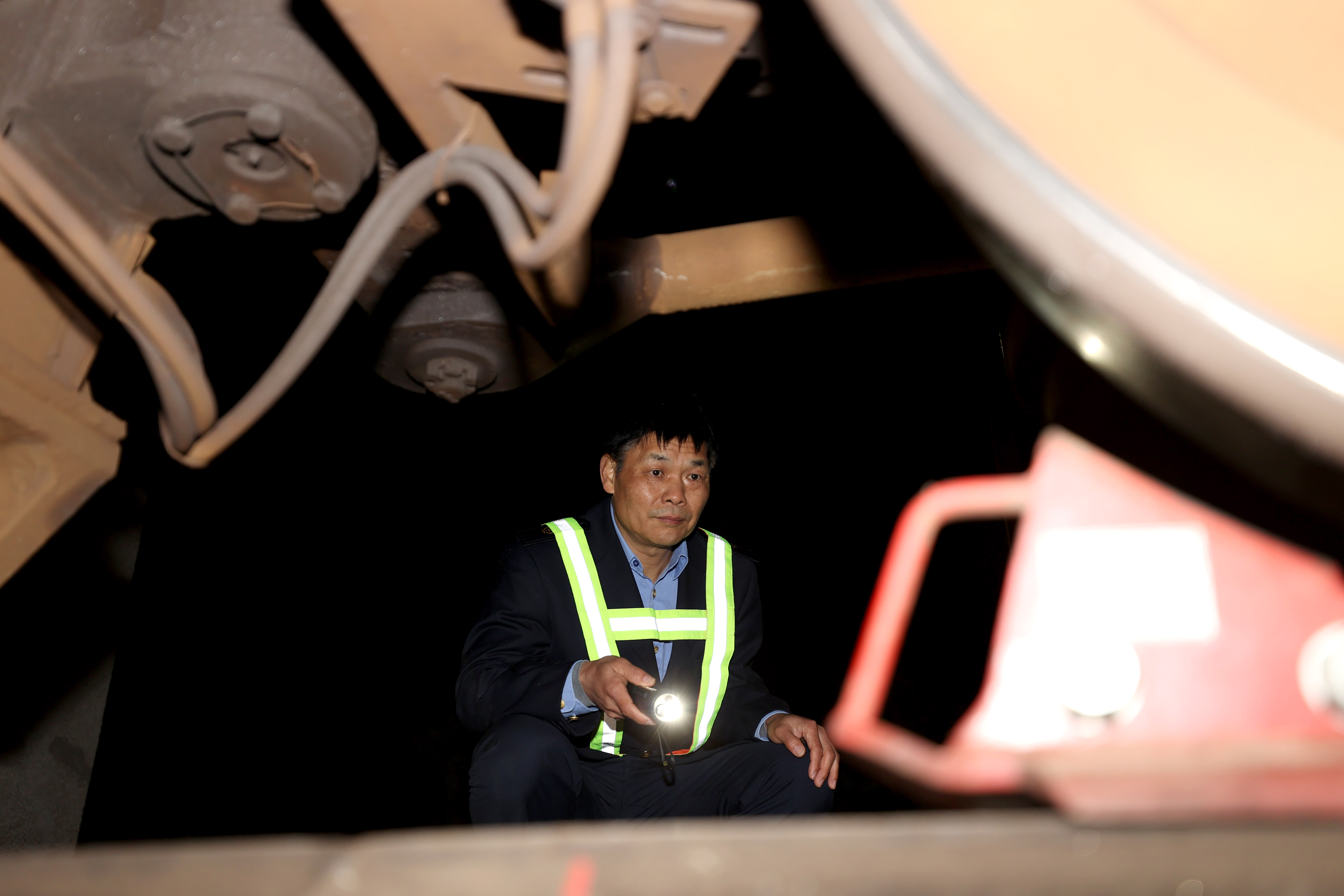 打著手電筒,逐一檢查停在整備場的機(jī)車防溜情況。