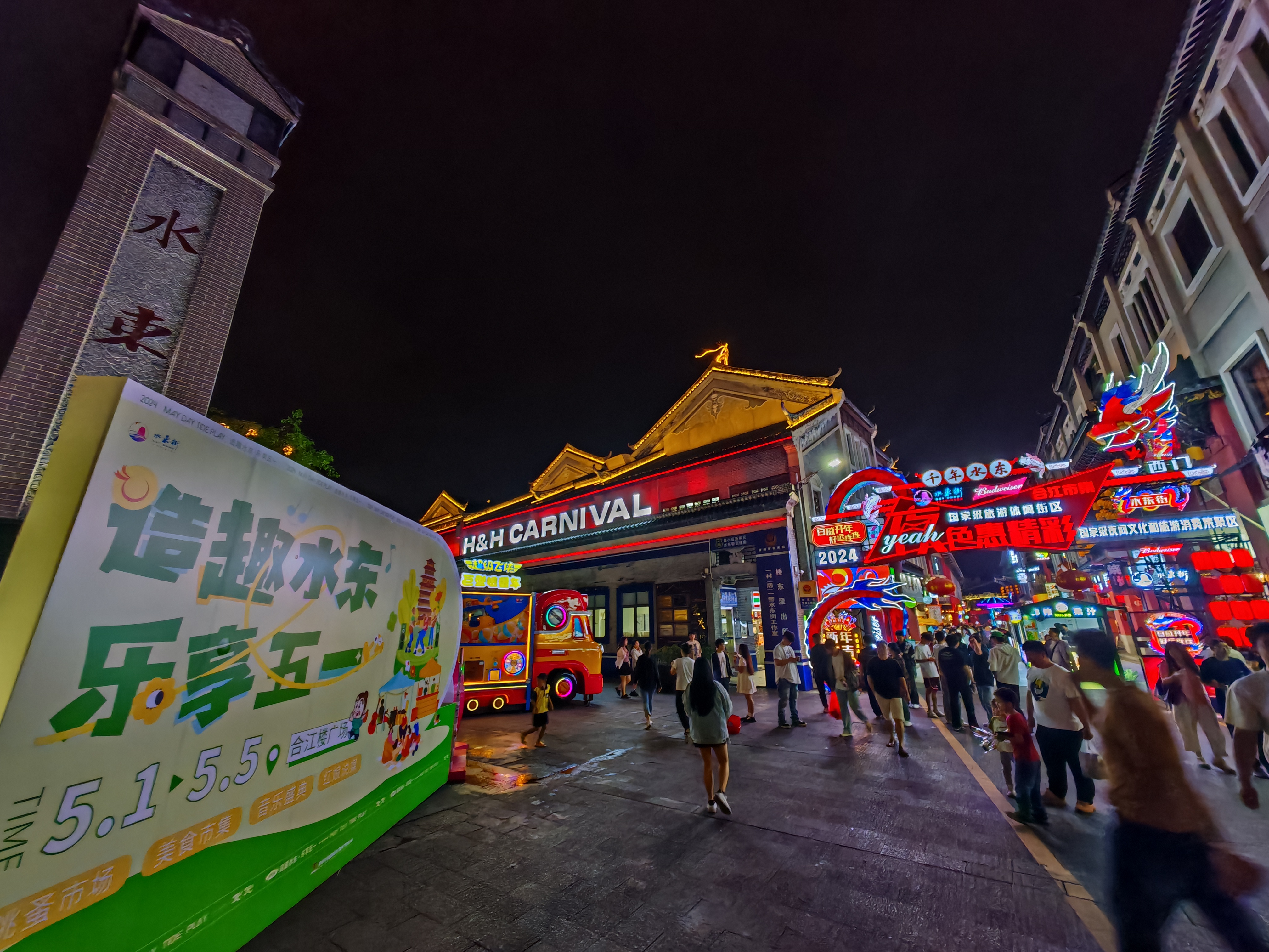隨著夜幕降臨,市區(qū)水東街“亮”了起來(lái),也愈加“熱”了起來(lái)。這里正舉辦惠州美食集市,邀約特色美食商家參與展示和銷售,還搭建了美食音樂(lè)節(jié)舞臺(tái)。不遠(yuǎn)處,人潮熙熙攘攘也很火爆。“五一”期間,這里有個(gè)性跳蚤市場(chǎng)、美食市集、音樂(lè)盛典、大紅娘朱姐說(shuō)媒等多種特色主題活動(dòng)。