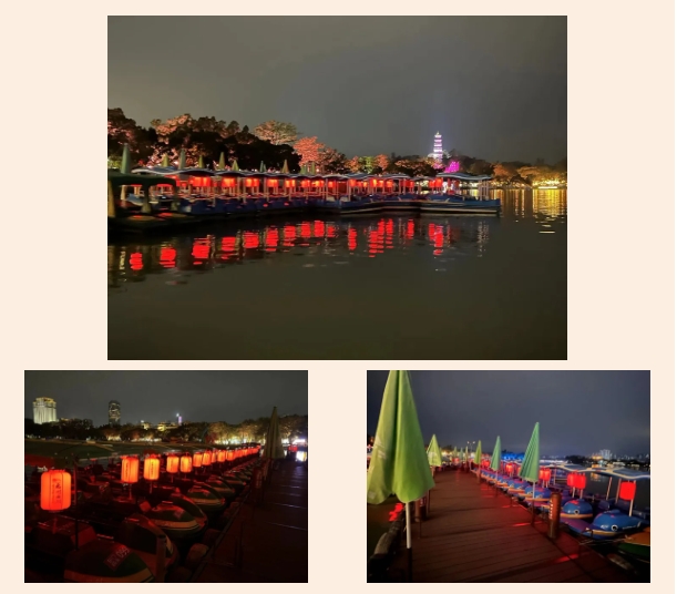 夜晚乘船蕩漾在湖面上