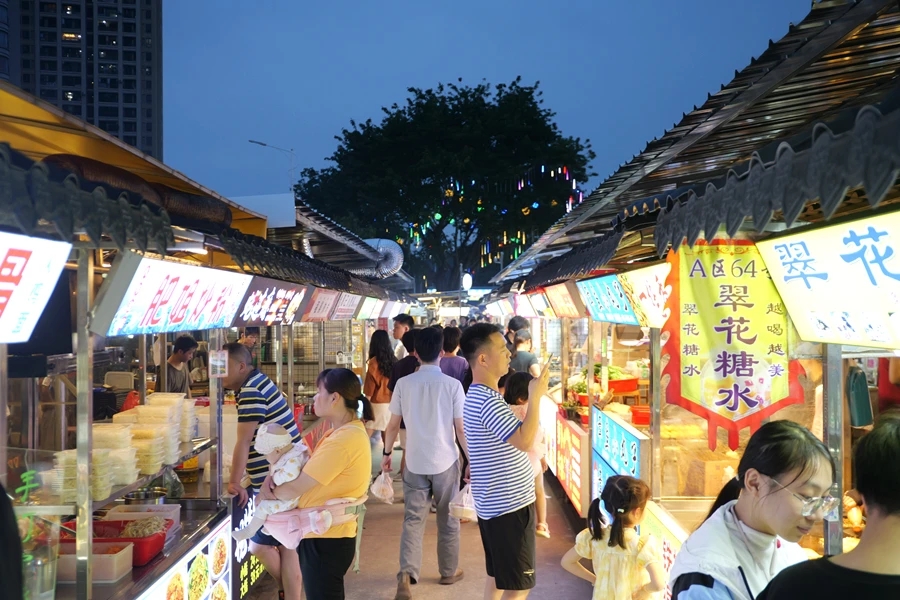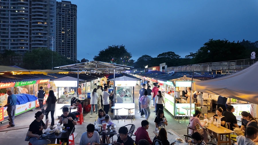 皓月園美食街占地面積不大,卻聚集著200余家美食攤位,每天下午4時起,這里就開始對外營業(yè)了,一直到晚上12時才結(jié)束。穿梭美食街中,蠔蛋燒、螺螄粉、蘿卜牛雜、腐乳雞翅、雜糧煎餅、甜品、飲料等各色小吃琳瑯滿目,香氣四溢、氤氳醉人,點亮“五一”假期夜生活。