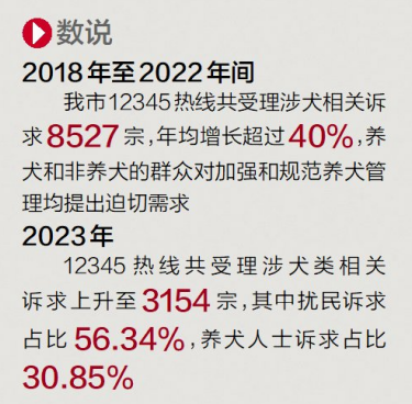 隨著家庭飼養(yǎng)的犬只種類、數(shù)量日益增多,由于認(rèn)知差異、管理缺失、政策滯后等因素,養(yǎng)寵人士和恐寵人士之間易產(chǎn)生矛盾。數(shù)據(jù)顯示,去年12345熱線共受理涉犬類相關(guān)訴求上升至3154宗,其中擾民訴求占比56.34%,養(yǎng)犬人士訴求占比30.85%。