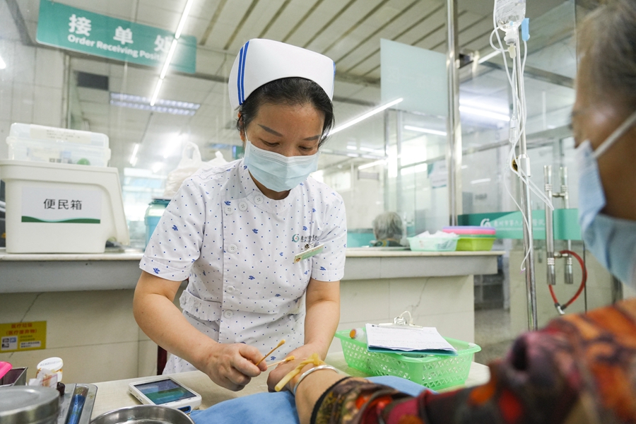 長期的輸液工作平凡又瑣碎,如何保持熱情和干勁?熊春艷說,設身處地想想,患者很不容易,自己能夠理解他們的處境,想盡自己所能去幫助他們。“當我看見患者手上靜脈穿刺成功回血的那一刻,成就感會油然而生!”熊春艷說,患者的一個小眼神,一句認可,都會讓自己動力十足。