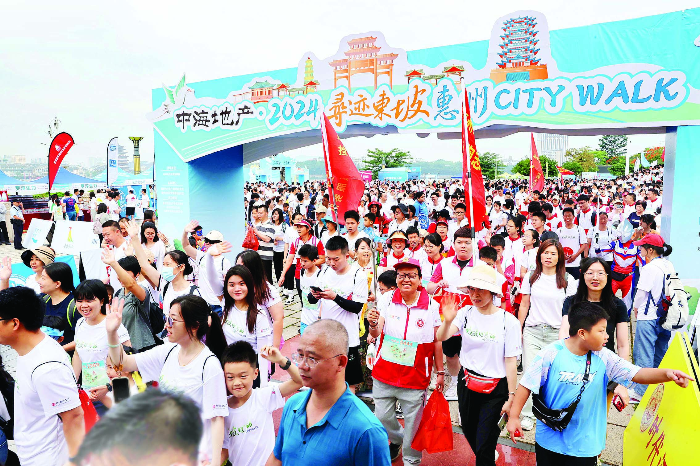 追尋東坡步伐,發(fā)現(xiàn)惠州的城市之美,2024“尋跡東坡”——惠州City walk活動(dòng)當(dāng)天上午7點(diǎn)半在東江公園啟動(dòng),來(lái)自大灣區(qū)各地3000名徒步愛(ài)好者,身著統(tǒng)一的T恤,用健康運(yùn)動(dòng)的方式感受惠州城市美景。他們順著風(fēng)光秀麗的東江美景一路向前,經(jīng)過(guò)惠州西湖東坡園、蘇堤等多處東坡寓惠點(diǎn),最終抵達(dá)東坡祠,全程約11公里。美景如同畫(huà)卷般漸次鋪展,領(lǐng)略東坡人文地標(biāo)的風(fēng)情。