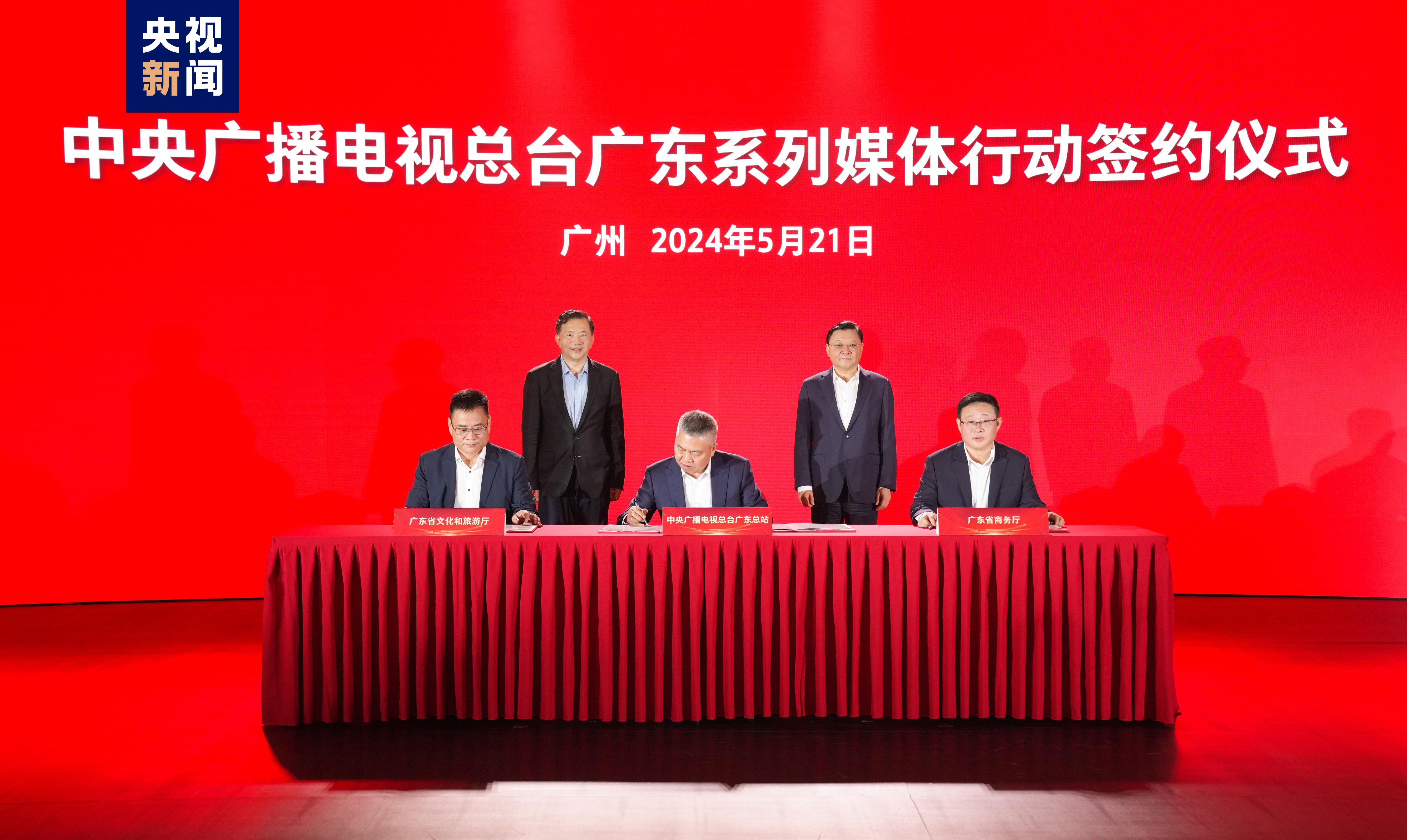 △總臺廣東總站黨委書記肖振生與廣東省文化和旅游廳廳長李斌、廣東省商務(wù)廳副廳長何軍簽署合作備忘錄