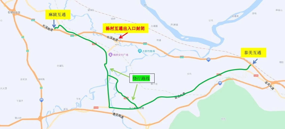 此前經(jīng)行楊村收費站的車輛。長深高速北往南行駛往博羅縣楊村鎮(zhèn)的車輛,請?zhí)崆皬穆橼槭召M站下高速繞行G205前往,或從泰美收費站下高速繞行G205前往;長深高速南往北行駛前往博羅縣楊村鎮(zhèn)的車輛,請?zhí)崆皬奶┟朗召M站下高速繞行G205前往,或從麻陂收費站下高速繞行G205前往。