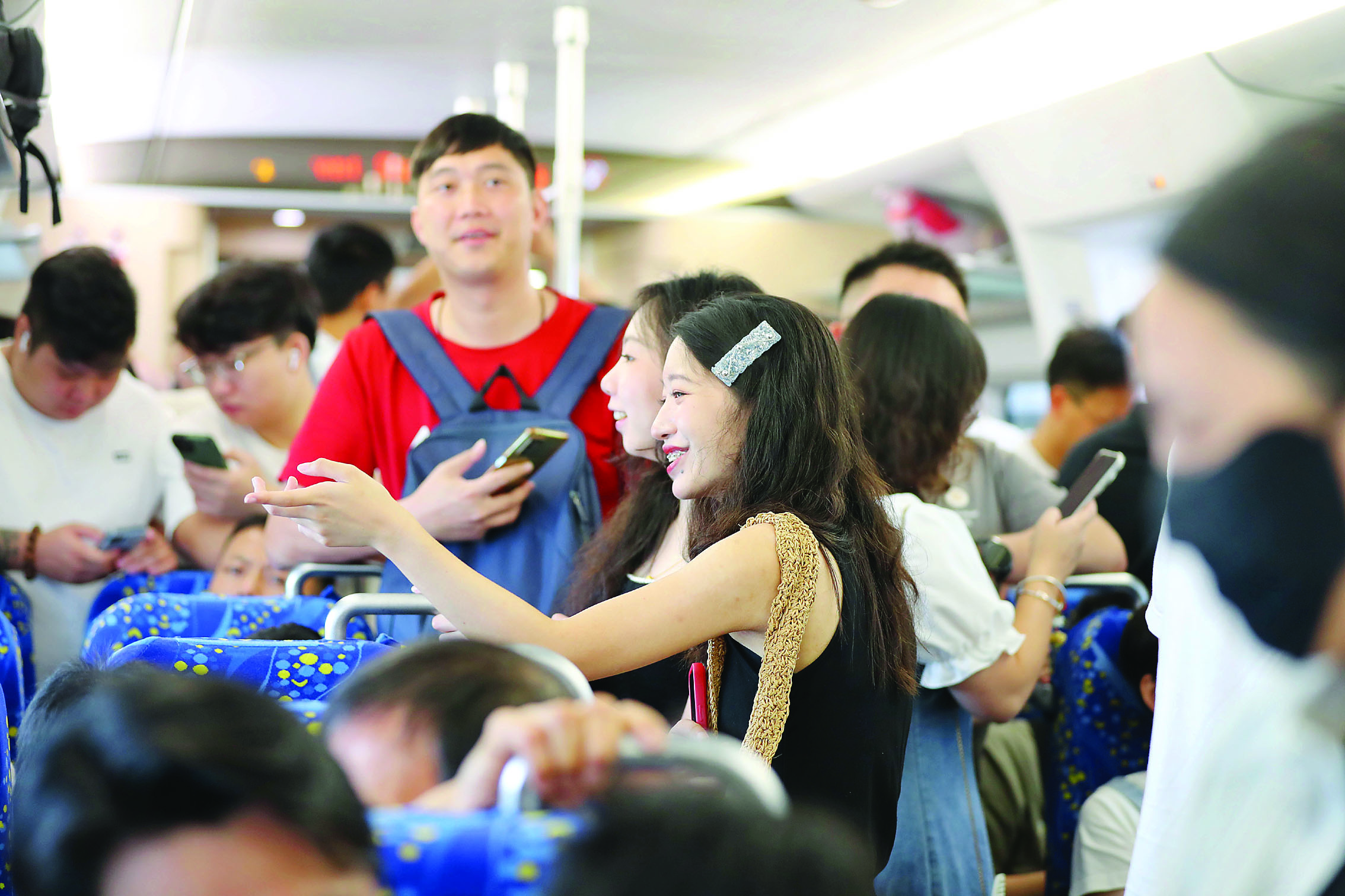 東莞至番禺段客流增加,旅客在車廂交流乘車感受。