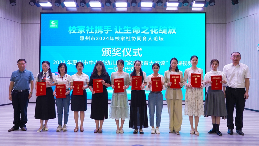 論壇上,2023年廣東省學(xué)校家庭社會協(xié)同育人典型案例獲獎代表、2023年惠州市中小學(xué)幼兒園“家庭教育大家談”微課視頻一等獎獲獎?wù)呱吓_領(lǐng)獎。