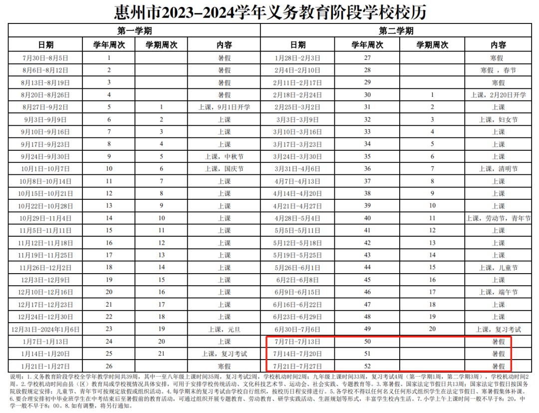 惠州市2023-2024學年義務(wù)教育階段學校校歷