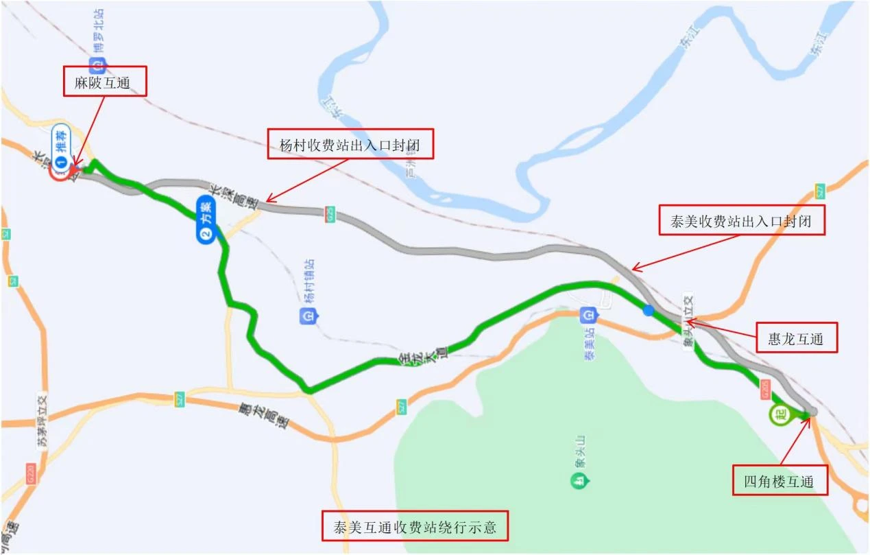 交通管制期間,長深高速北往南行駛往博羅縣泰美鎮(zhèn)的車輛,請?zhí)崆皬穆橼槭召M(fèi)站下高速繞行國道G205前往;長深高速南往北行駛前往博羅縣泰美鎮(zhèn)的車輛,請?zhí)崆皬乃慕菢鞘召M(fèi)站下高速繞行國道G205前往。