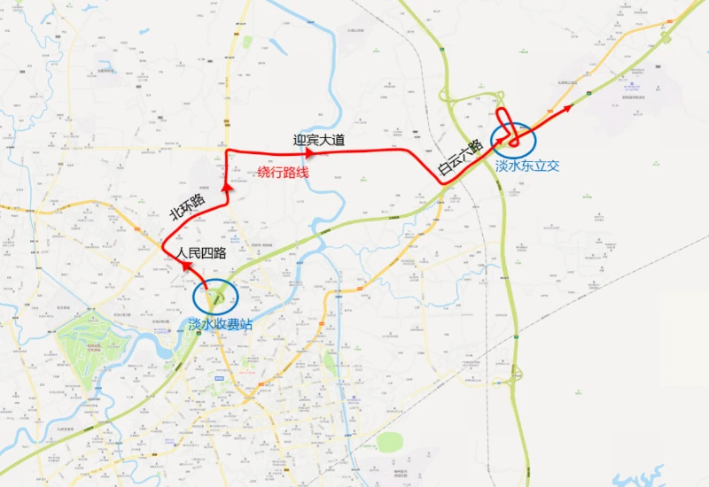 G15沈海高速淡水收費站相關(guān)匝道臨時封閉期間繞行示意圖。