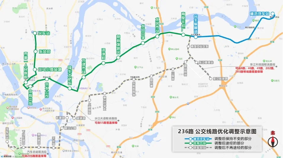 線路調整:取消236路南旋工業(yè)區(qū)東至汽車總站路段及沿線34個站點,改由合生愉景灣直行經龍和路、龍湖大道、人民路、云山東路、云山西路、文昌二路、三新南路、惠州大道行駛至火車站。停運236路區(qū)間線,2條公交線路合并。