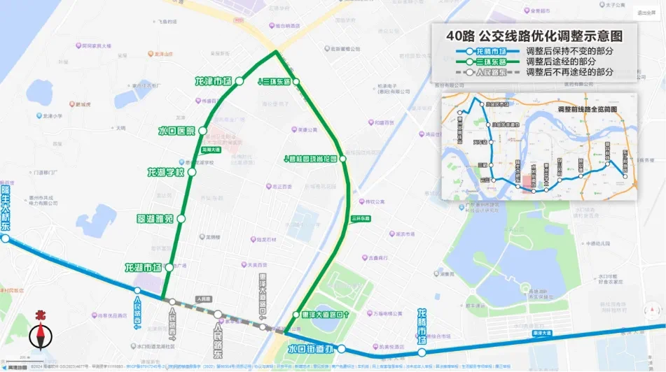 線路調整:取消40路行駛人民路東段,改由惠澤大道經三環(huán)東路、龍湖大道至人民路西段接回原線路行駛。