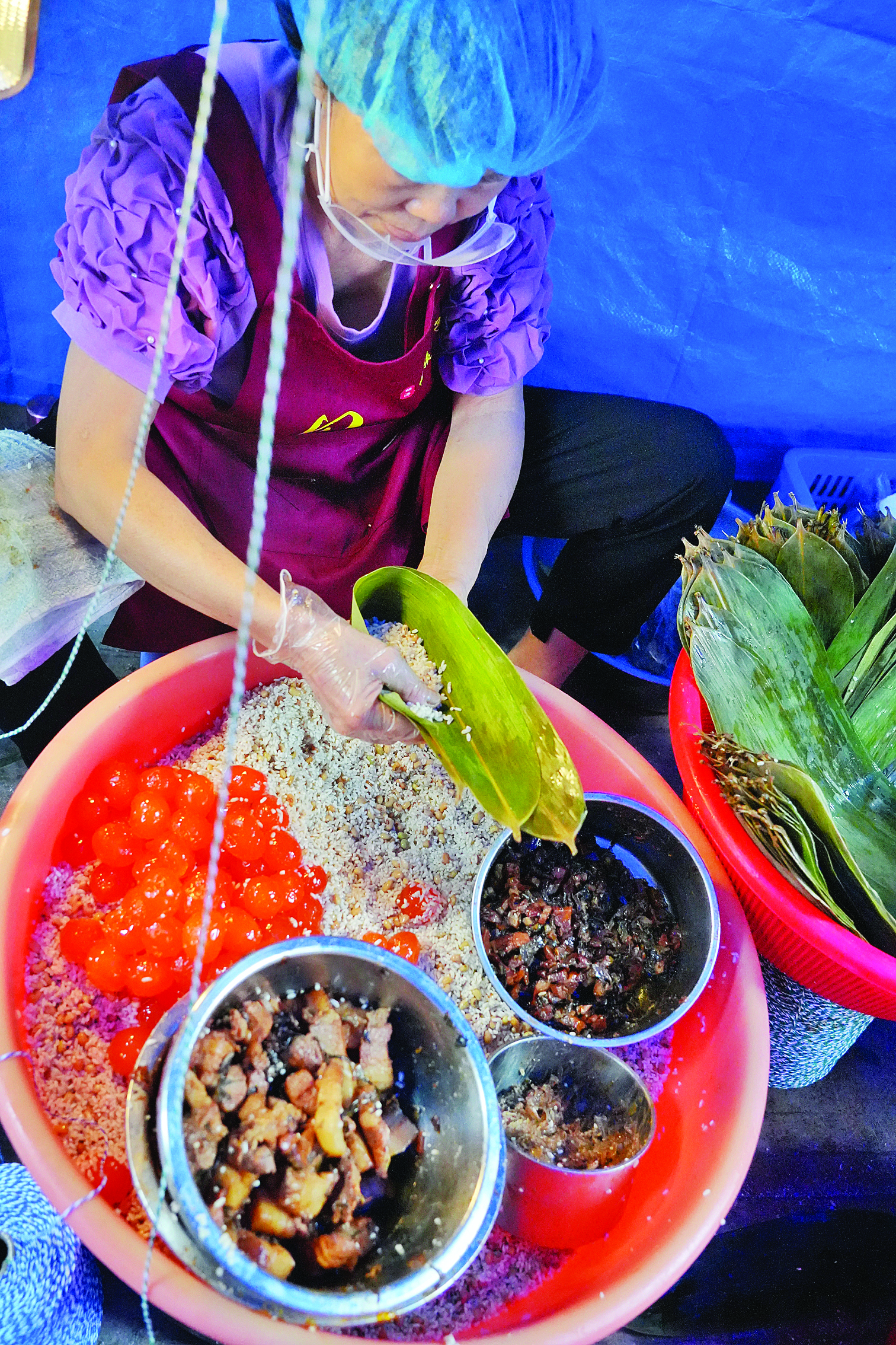 橫瀝梅姨粽子店的店員在包梅菜扣肉粽。 本組圖片(除署名外) 惠州日?qǐng)?bào)記者朱金贊 實(shí)習(xí)生田瀅 攝