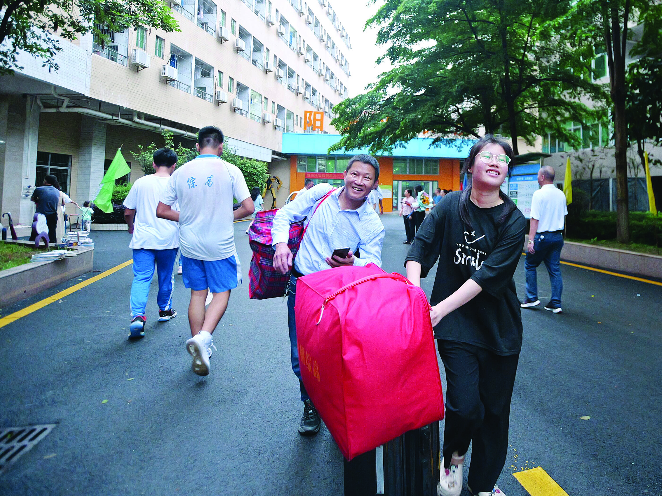 一家人齊齊來到學(xué)校幫忙拿行李。