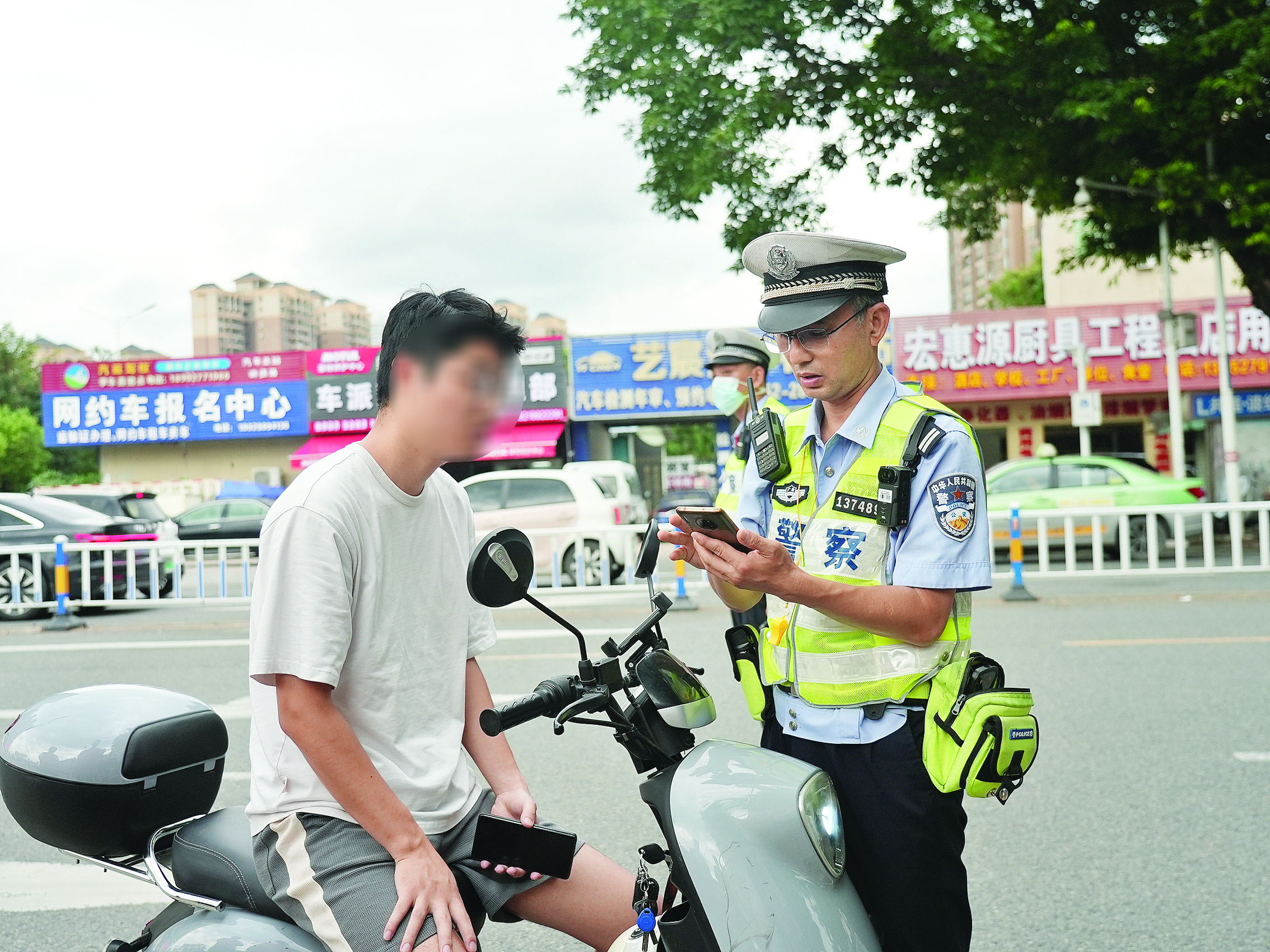 執(zhí)勤交警對(duì)不戴頭盔者進(jìn)行宣教勸導(dǎo)。惠州日?qǐng)?bào)記者哈鵬 攝