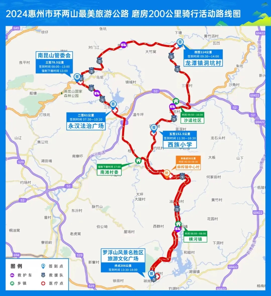 羅浮山風(fēng)景名勝區(qū)旅游文化廣場(chǎng)(起點(diǎn))→羅浮大道→ X223縣道→顯崗水庫(kù)→橫河鎮(zhèn)→麻榨鎮(zhèn)中心村→X223縣道→橫漢村→桂村→X261縣道→永漢鎮(zhèn)法治廣場(chǎng)→南昆山盤山公路→G355國(guó)道→南昆山管委會(huì)→X222縣道→龍?zhí)舵?zhèn)洞坑村→新竂村→Y124鄉(xiāng)道→西溪村→G355國(guó)道→雙東村→Y127鄉(xiāng)道→沙逕社區(qū)→X219縣道→到灘村→西族小學(xué)→X219縣道→橫漢村→X223縣道→麻榨鎮(zhèn)中心村→橫河鎮(zhèn)→羅浮大道→羅浮山風(fēng)景名勝區(qū)旅游文化廣場(chǎng)(終點(diǎn)),全程共約203公里。