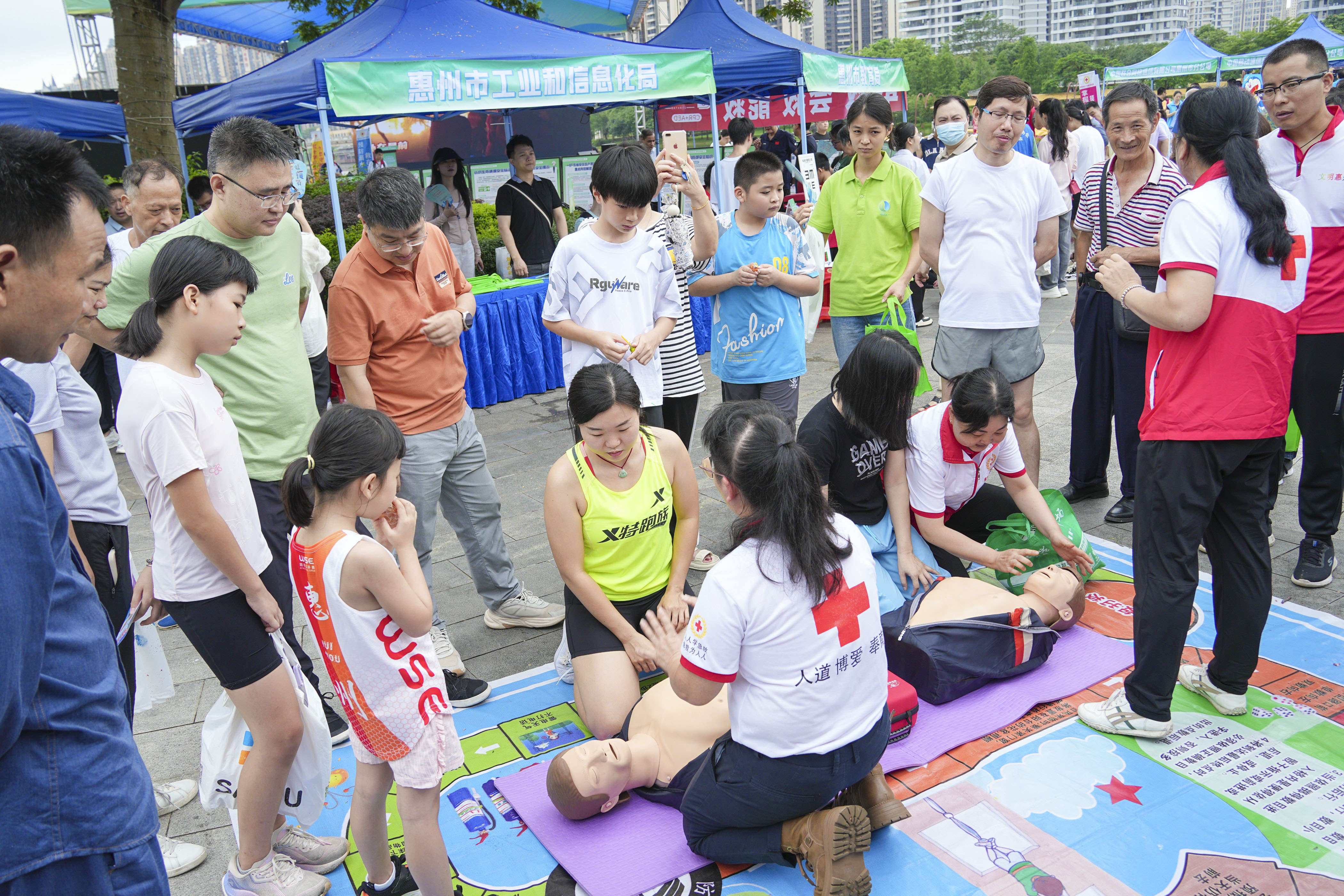 安全救援人員一邊做心肺復(fù)蘇演示,一邊為群眾講解急救技巧。惠州日報記者姚木森 攝