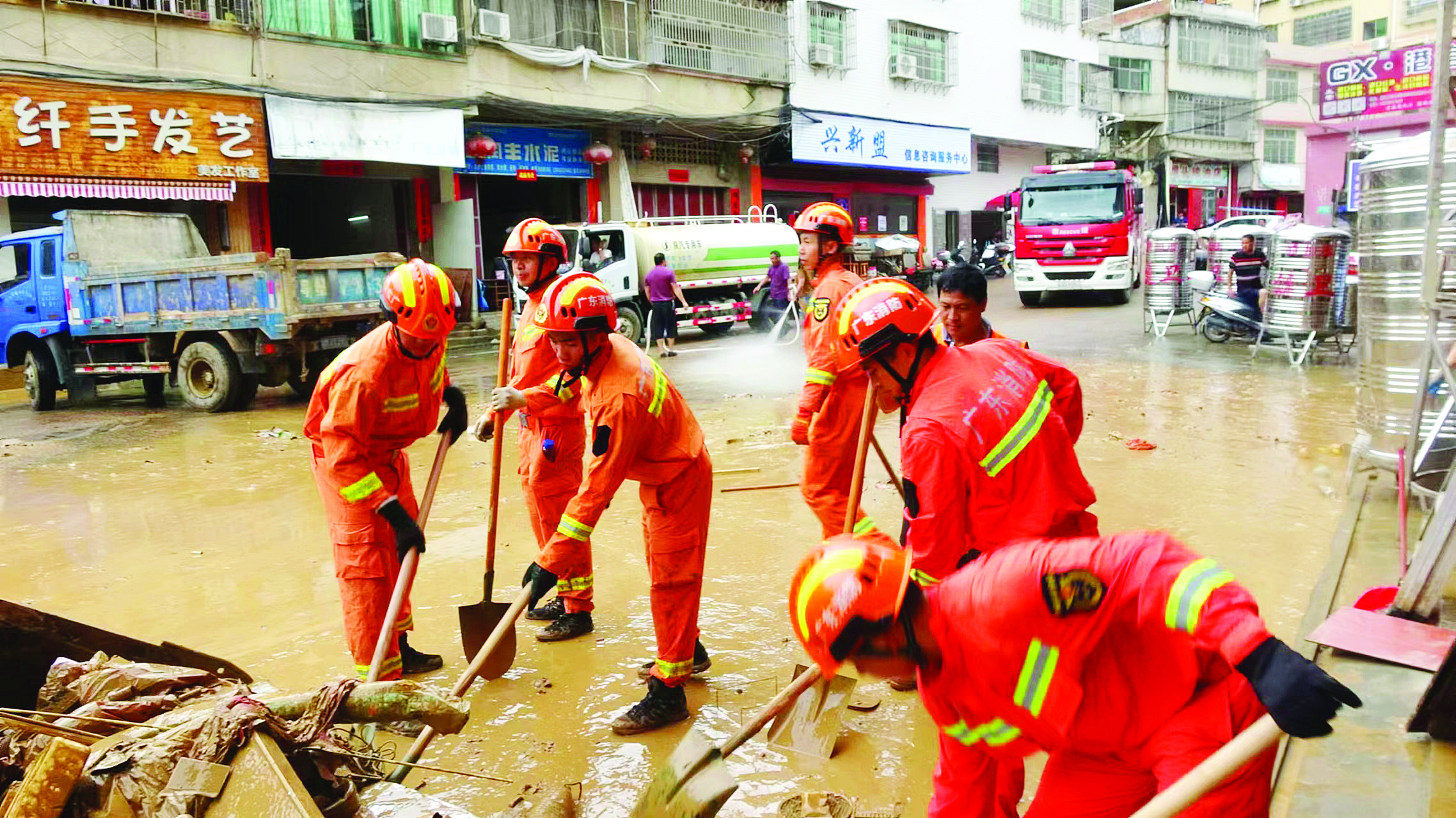 惠州消防隊(duì)員在清理街道上的淤泥雜物。惠州日?qǐng)?bào)記者譚琳 通訊員惠消宣 攝