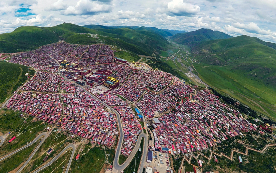 距色達(dá)縣城20余公里有一條山溝叫喇榮溝,順溝上行數(shù)里,蔚藍(lán)蒼穹之下,銀嶺碧草之間,一片紅色的房子散布在山谷中,星星點(diǎn)點(diǎn),如眾星拱月般簇?fù)碇鴰鬃鸨梯x煌的大殿——它就是藏于深山中的喇榮寺五明佛學(xué)院。這是世界最大的藏傳佛教佛學(xué)院。夜幕降臨時(shí),燈光點(diǎn)亮了這個(gè)紅色的世界,錯(cuò)落有致地映襯出山谷的輪廓,景象更加令人震撼。