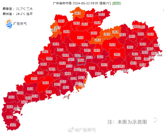 22日,副高控制下,廣東陸地天氣高溫炎熱,局地有分散陣雨或雷雨;
