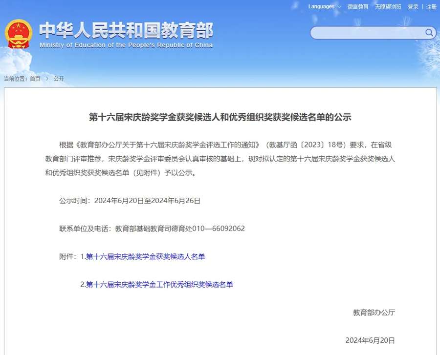 根據(jù)《教育部辦公廳關(guān)于第十六屆宋慶齡獎(jiǎng)學(xué)金評(píng)選工作的通知》(教基廳函〔2023〕18號(hào))要求,在省級(jí)教育部門(mén)評(píng)審?fù)扑],宋慶齡獎(jiǎng)學(xué)金評(píng)審委員會(huì)認(rèn)真審核的基礎(chǔ)上,現(xiàn)對(duì)擬認(rèn)定的第十六屆宋慶齡獎(jiǎng)學(xué)金獲獎(jiǎng)候選人和優(yōu)秀組織獎(jiǎng)獲獎(jiǎng)候選名單予以公示。公示期自2024年6月20日至2024年6月26日。