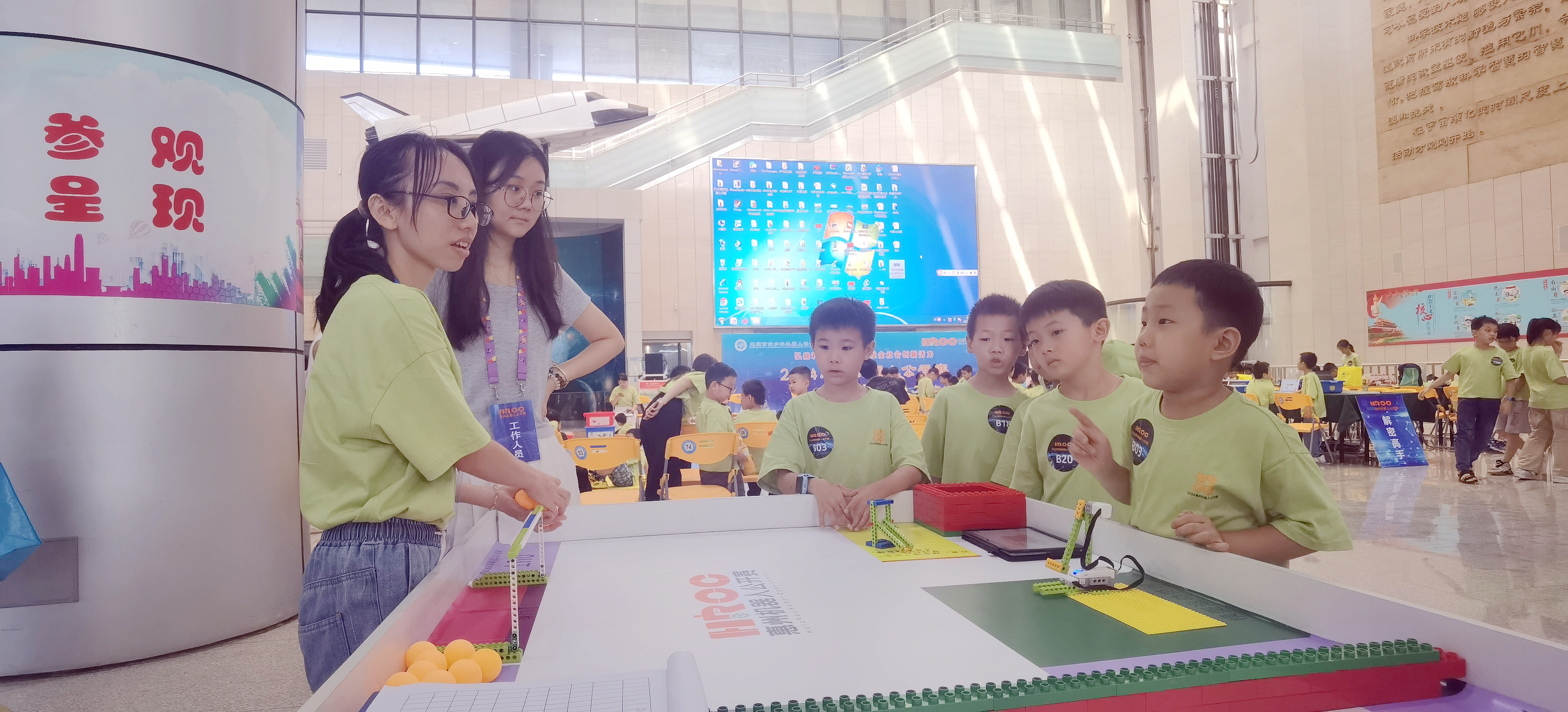 當(dāng)日上午8時(shí)45分,在惠州科技館一樓大廳,參賽隊(duì)員陸續(xù)報(bào)到、進(jìn)場(chǎng)。本次賽事設(shè)有完美復(fù)制、解密高手、精彩射門、機(jī)器人冰壺賽、機(jī)器人足球賽5大項(xiàng)目。