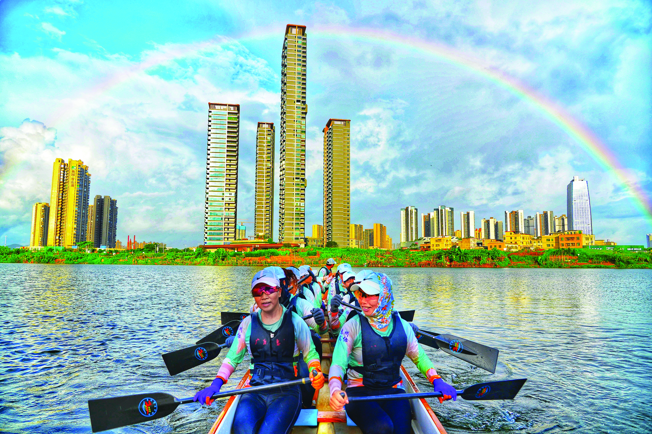 6月25日上午6時(shí),在惠城區(qū)金山湖公園,一支有著26名隊(duì)員的惠州市龍舟協(xié)會(huì)隊(duì)伍正在緊張訓(xùn)練,為備戰(zhàn)29日舉行的惠州市龍舟賽作準(zhǔn)備。現(xiàn)場(chǎng)船槳起舞,龍舟似蛟龍出水,乘風(fēng)破浪;在舟頭的鼓手雙槌并下,隊(duì)員們跟著鼓點(diǎn)奮勇?lián)]漿。彩排時(shí),一道彩虹橫跨藍(lán)天,與龍舟、浪花相互交織,場(chǎng)面頗為壯觀。讓我們共同期待6月29日的龍舟賽,一起見(jiàn)證水上速度與激情!
