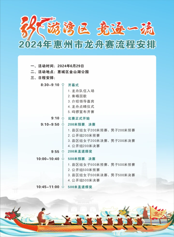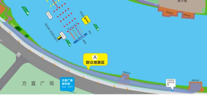 本次惠州市龍舟賽將在金山湖公園內(nèi),方直廣場(chǎng)前方湖面舉行,市民在湖岸兩邊均可觀賽。