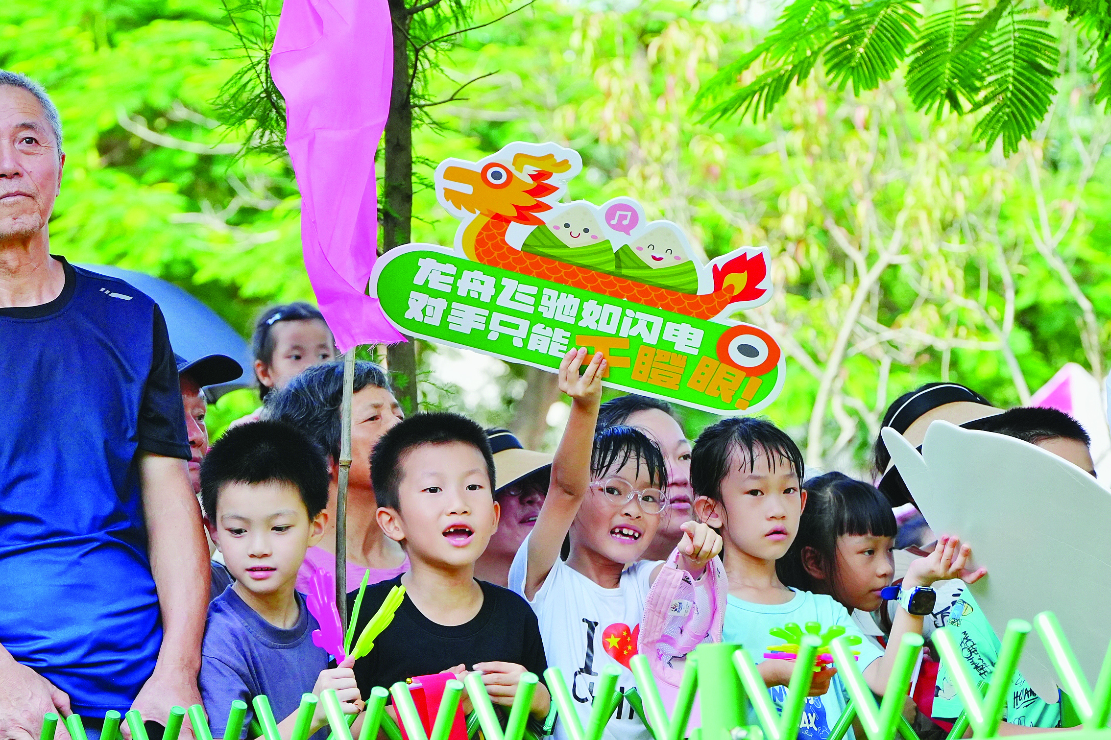 孩子們到現(xiàn)場(chǎng)為龍舟賽加油。
