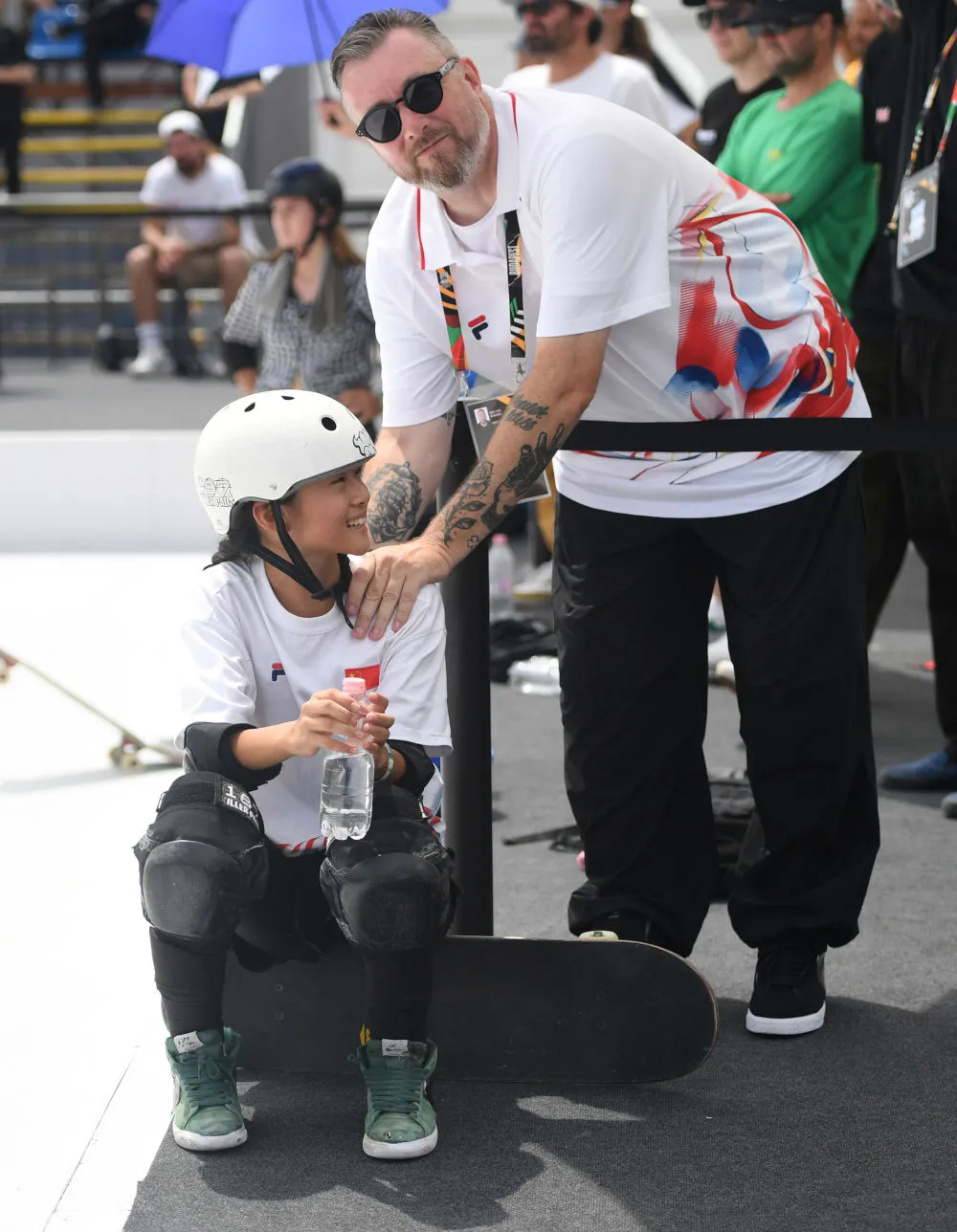 6月20日,鄭好好(左)在比賽間隙與教練互動,她在預(yù)賽中最佳成績?yōu)?2.60分。當(dāng)日,巴黎奧運(yùn)會資格系列賽布達(dá)佩斯站滑板女子碗池預(yù)賽在布達(dá)佩斯舉行。新華社記者 賀燦鈴 攝
