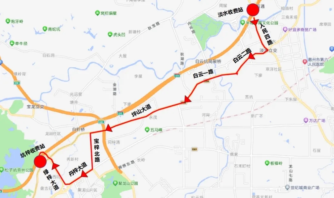 期間,原經淡水收費站深圳方向上行匝道上高速的車輛,可繞行人民四路→白云二路→白云一路→坪山大道→寶梓北路→丹梓大道→綠梓大道→坑梓收費站上高速。