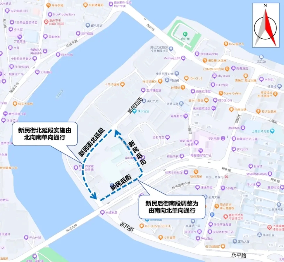 為進一步優(yōu)化道路交通組織,提升道路通行效率,暢通區(qū)域道路微循環(huán),市公安局交警支隊根據《中華人民共和國道路交通安全法》有關規(guī)定,將對惠城區(qū)橋東街道新民街北延段、新民后街南段實施單向通行交通組織措施。