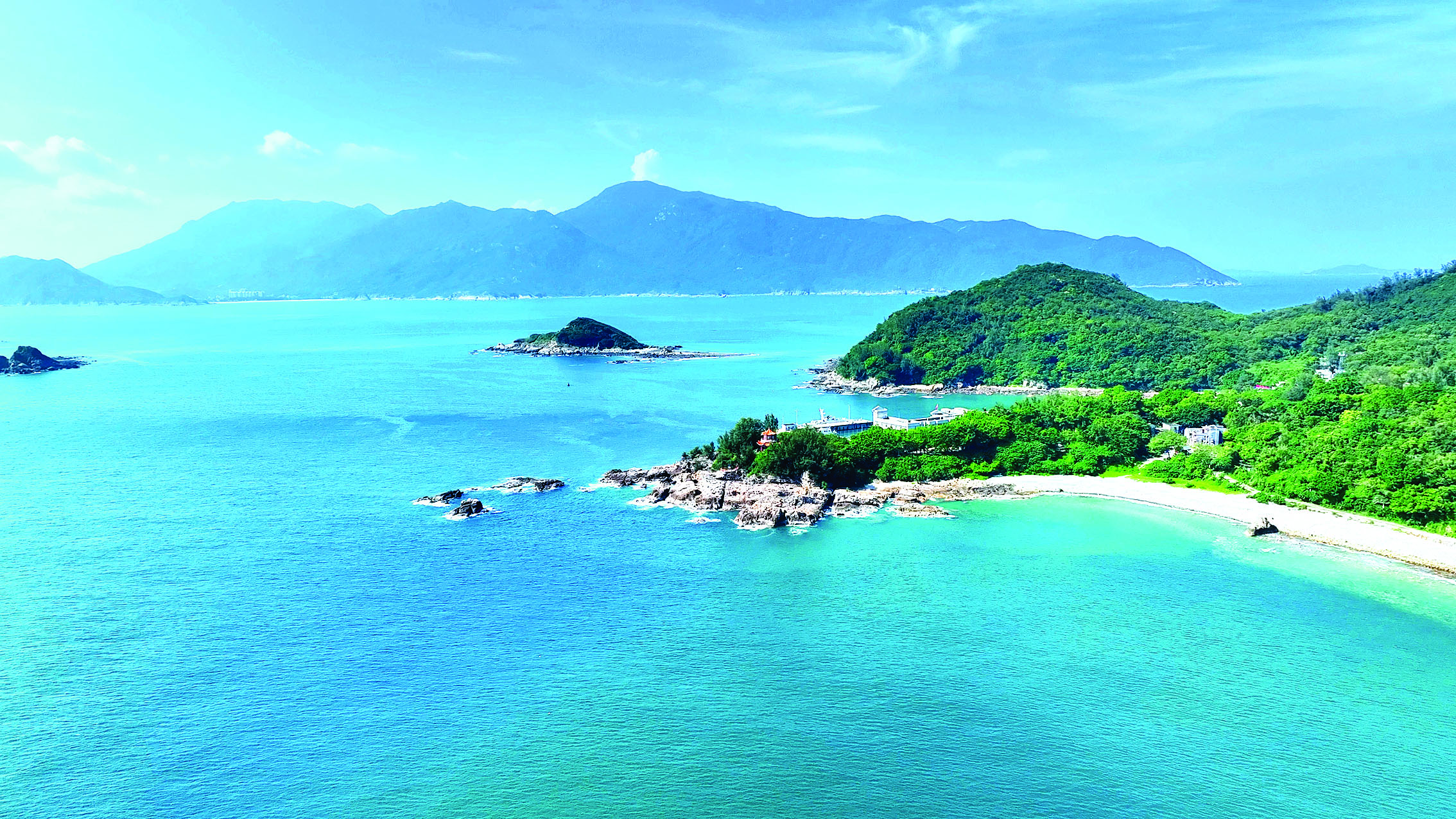 三門島位于大亞灣澳頭南面17海里處,是大亞灣最大最高的島,分為大三門島和小三門島,平常所說的三門島一般指大三門島。從澳頭漁人碼頭搭乘快艇,陸地的身影漸漸遠(yuǎn)去,沿途所見皆是原生態(tài)的青翠島嶼,行船約一個小時,一塊仿佛鑲嵌在碧藍(lán)大海上的“綠寶石”——三門島出現(xiàn)在視野中。島上風(fēng)光旖旎,兼具濃厚的歷史文化底蘊。