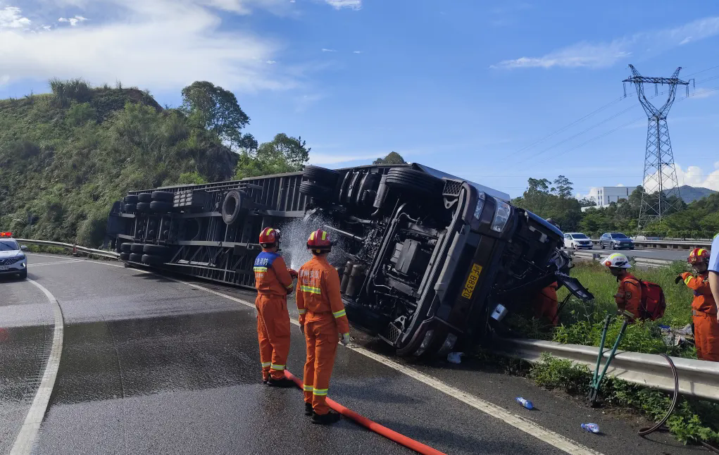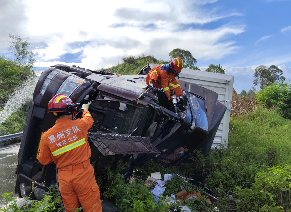 現(xiàn)場(chǎng)消防員了解到,一輛快遞貨運(yùn)掛車由浙江出發(fā)前往東莞,途徑甬莞高速轉(zhuǎn)惠大高速立交橋,在高速匝道發(fā)生側(cè)翻,導(dǎo)致油箱漏液。一名被困人員已被救出,另外一名駕駛員因車頭撞擊嚴(yán)重變形導(dǎo)致雙腿被卡無法脫困。