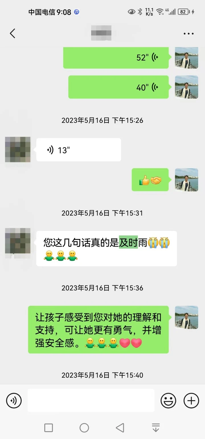 去年12月后,學競因為工作很忙,讓沁和沁媽去自我成長,她們一直努力向前走著。不久前中考結(jié)束后,就有了文章開頭的一幕。當學競肯定了沁媽的付出后,沁媽回復道:“我們只能做好自己能做的,關(guān)鍵還是她自己的努力與堅持!這一路走來真的不容易,關(guān)鍵時刻特別感謝有您的幫助與指導!愛你,感恩遇見!”