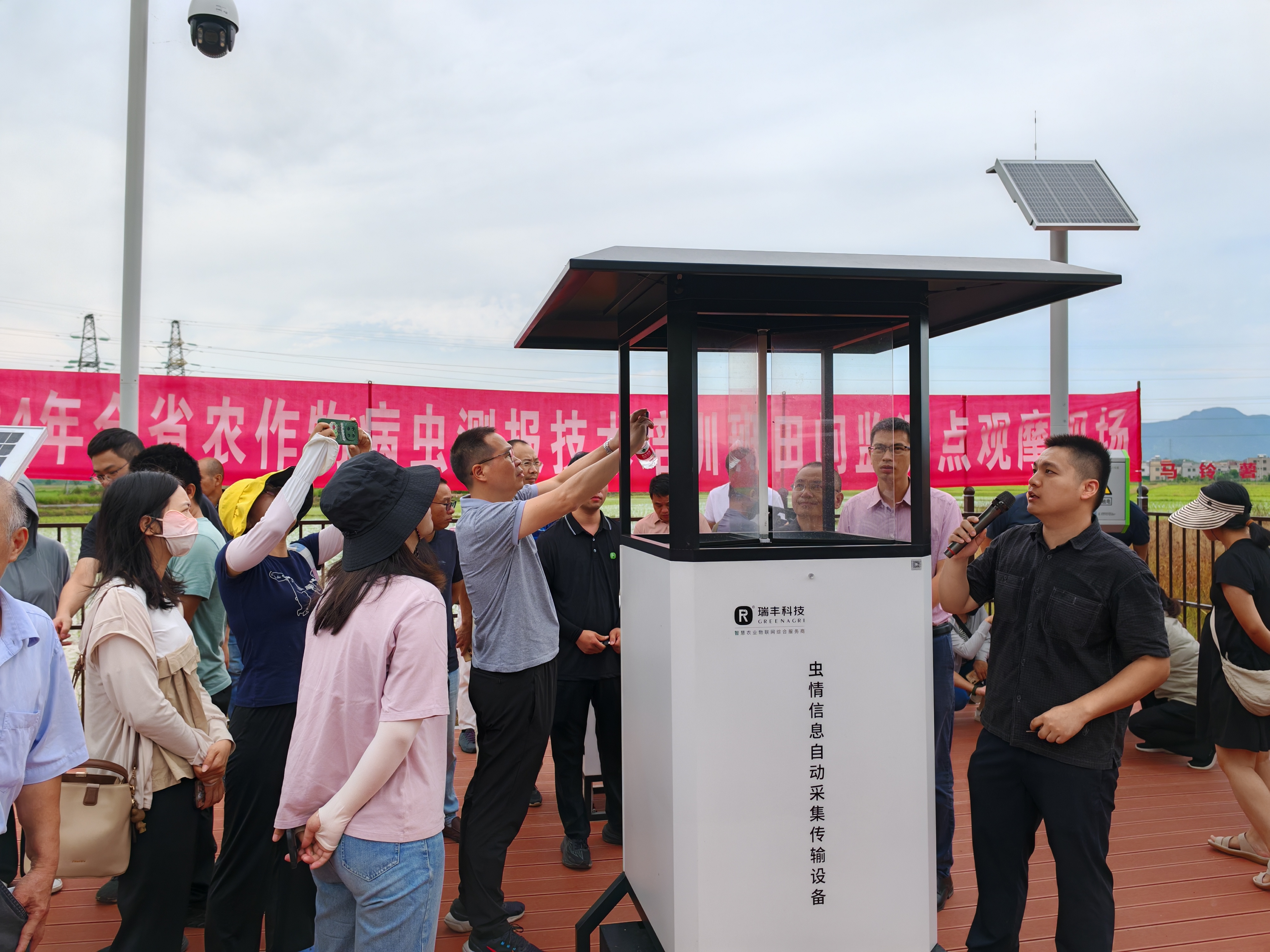 正值暑期,位于小屯村的夏種水稻,一片綠意盎然。稻田里,來自全省各地植保植檢部門的負責(zé)人、技術(shù)骨干60余人,在田間監(jiān)測點觀摩現(xiàn)場,熱情高漲地感受農(nóng)作物病蟲害監(jiān)測預(yù)警的智能化。