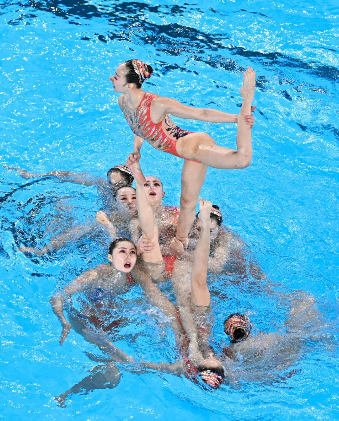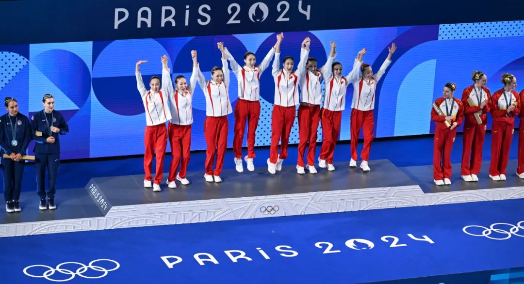 盡管動(dòng)作完成得如此出色,此前在集體技術(shù)自選和集體自由自選中,又獲得了近70分的領(lǐng)先優(yōu)勢,但出水后的姑娘們?nèi)圆桓覒c祝。直到現(xiàn)場宣布冠軍屬于中國時(shí),教練和隊(duì)員們才釋放了自己全部的情緒。