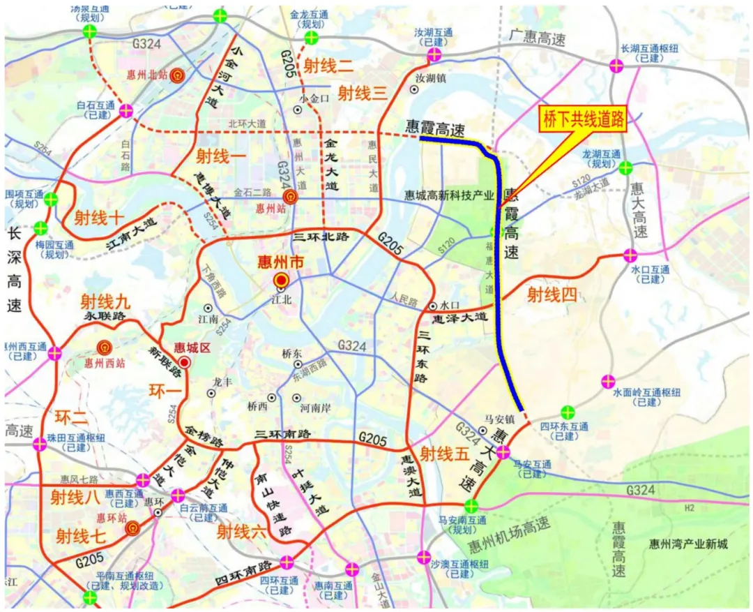 根據(jù)公告顯示,一號公路(惠霞高速東江灣產(chǎn)業(yè)園段)將建11.35公里長的橋下共線道路,與1號公路(惠霞高速)AK13~AK24段形成復合廊道。