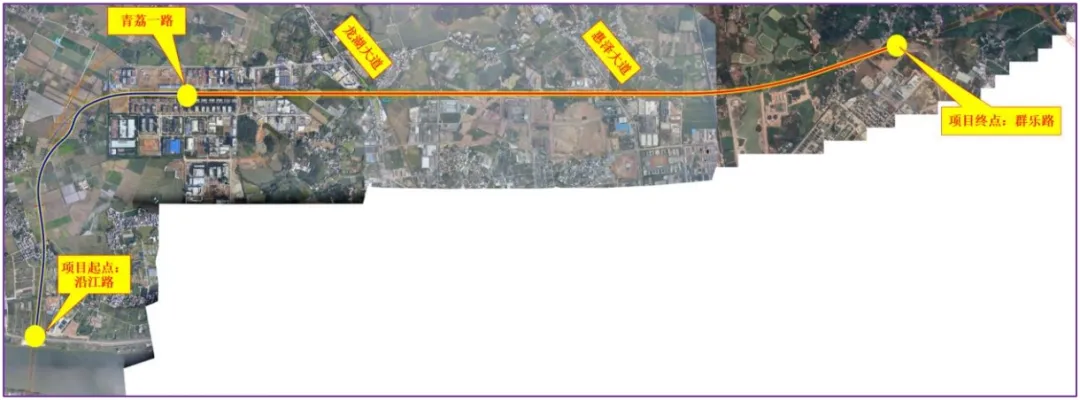 項目全長11.35千米,道路等級為城市主干路,紅線寬度60米,分為兩期實施,其中一期為青荔一路至群樂路路段,道路長7.63千米、寬45.5米,為雙向六車道;二期為沿江路至青荔一路路段,道路長3.72千米、寬14.5米,為雙向四車道。