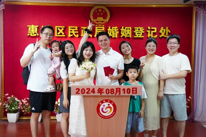 當天上午8時30分許,記者來到惠城區(qū)民政局婚姻登記處看到,新人們井然有序地在前臺領(lǐng)表填表,等待窗口叫號。他們有的身著情侶裝,有的頭戴白紗,有的手捧鮮花,有的帶“親友團”前來見證,讓結(jié)婚登記充滿儀式感。