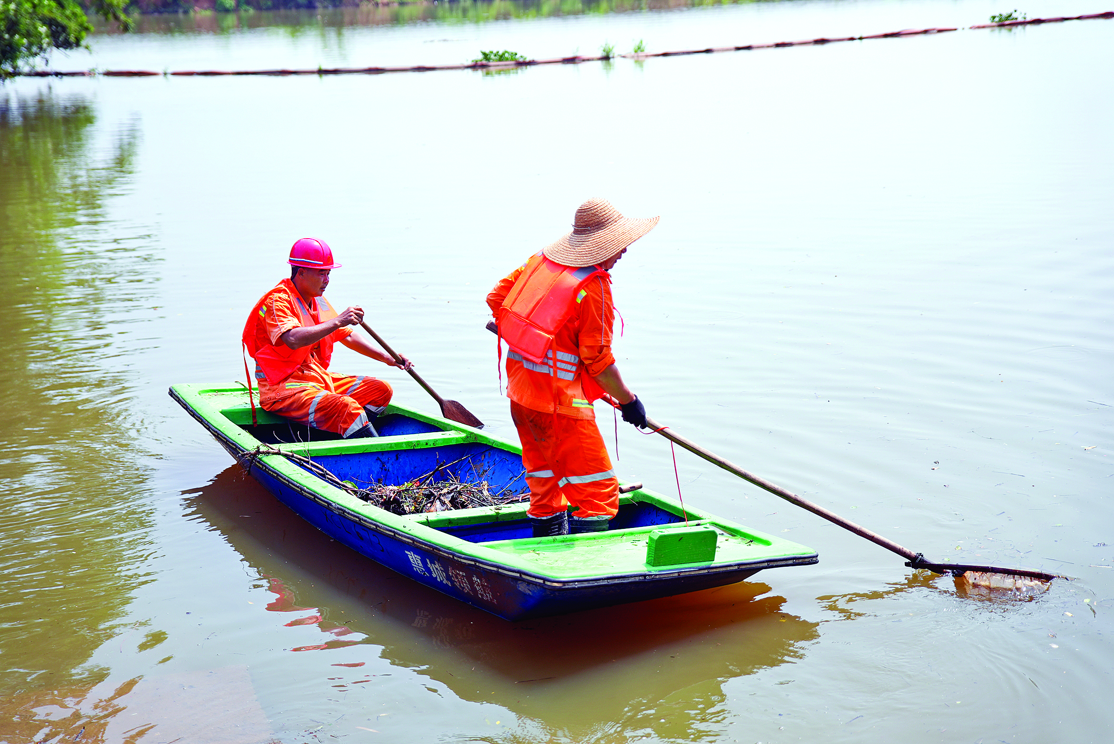 兩名環(huán)衛(wèi)工人身著救生衣在小船上清理三棟木瀝河中的垃圾。惠州日?qǐng)?bào)記者羅劍業(yè) 攝