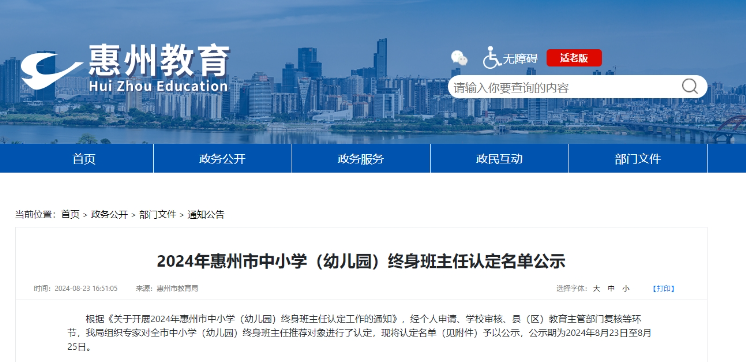 公示原文如下:2024年惠州市中小學(幼兒園)終身班主任認定名單公示