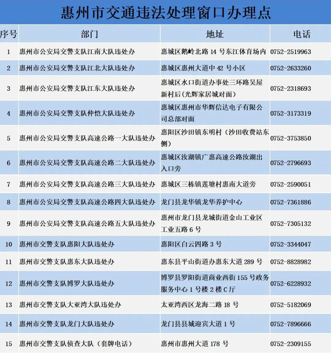 附:惠州市各交警大隊交通違法處理窗口辦理點