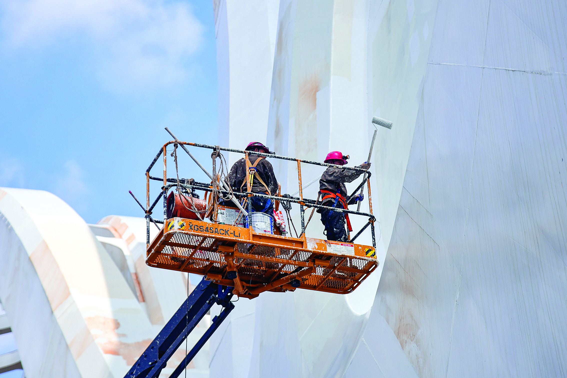 工人們正在給鵝城大橋“鵝”身刷漆。惠州日報(bào)記者羅劍業(yè) 攝