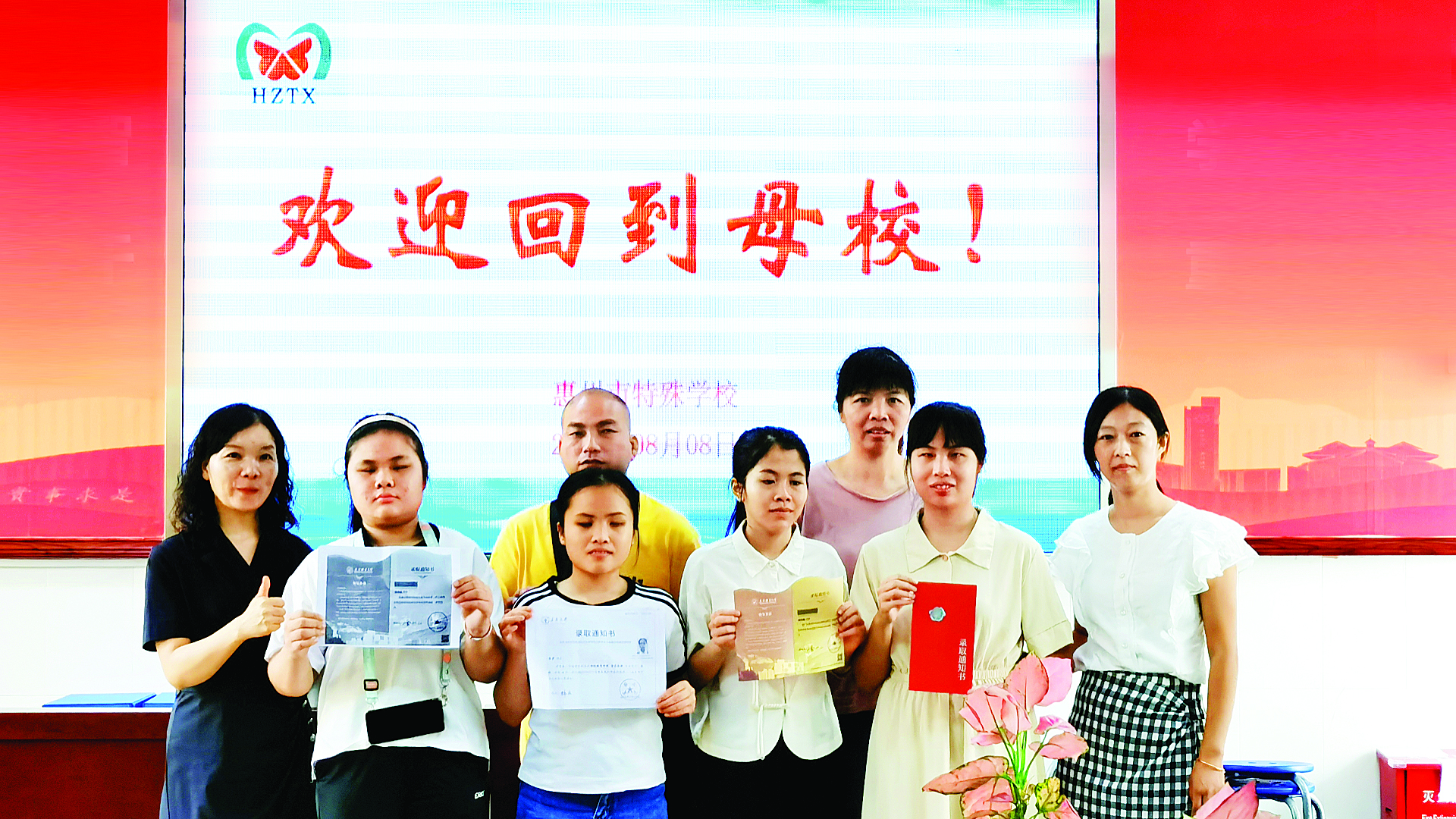 惠州市特殊學(xué)校5位考生在不久前考上了心儀的大學(xué),圖為其中四位同學(xué)和老師、家長合影。惠州日報(bào)記者賴華海 攝