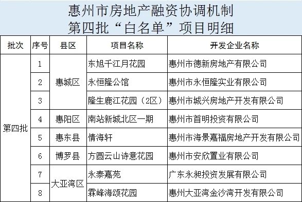 9月5日,惠州市房地產(chǎn)融資協(xié)調(diào)機制工作專班推送第四批“白名單”項目,永恒隆公館、永泰嘉苑等8個項目被列入。