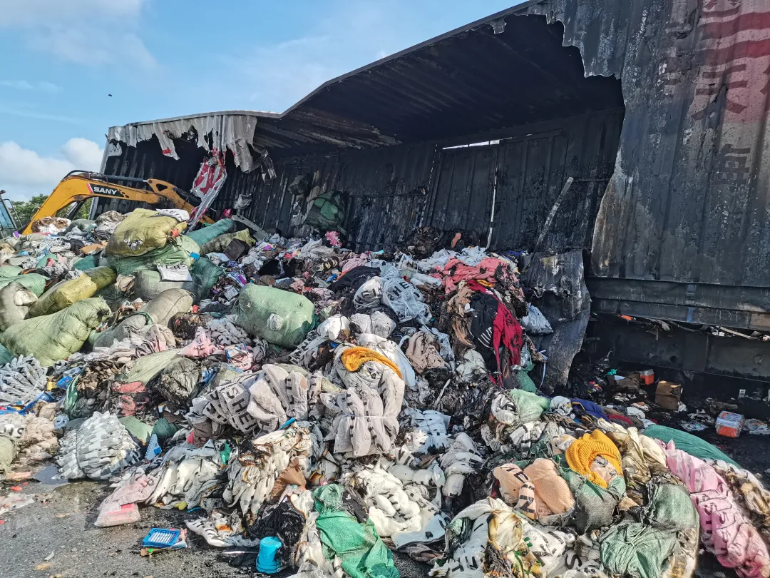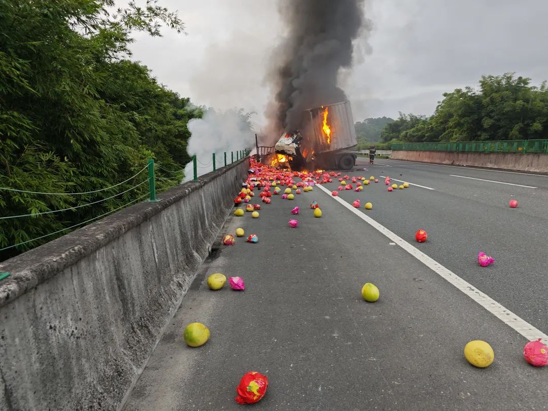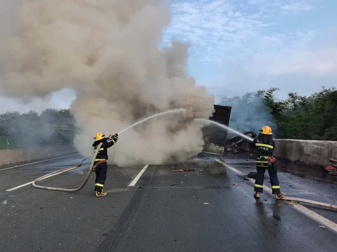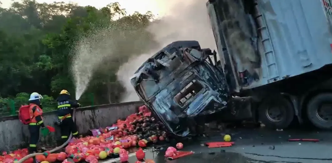 由于兩車(chē)相撞起火,貨物正猛烈燃燒,