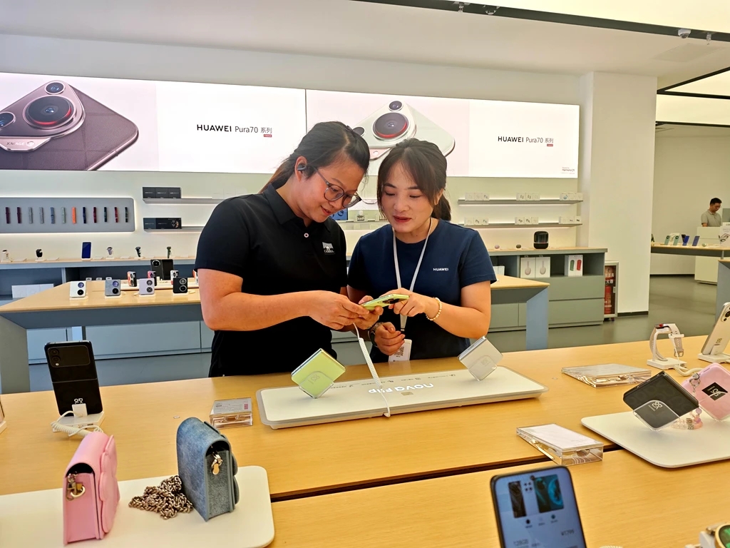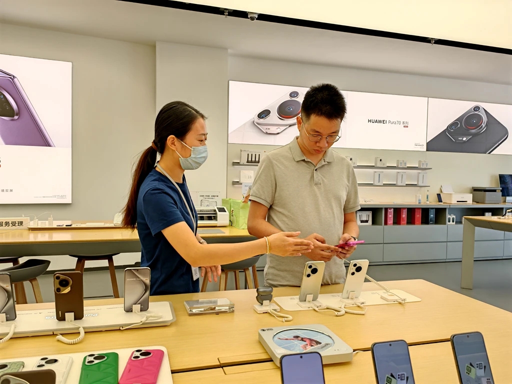 在港惠購物中心旺達華為手機授權體驗店,有不少顧客前來咨詢和選購折疊屏手機。