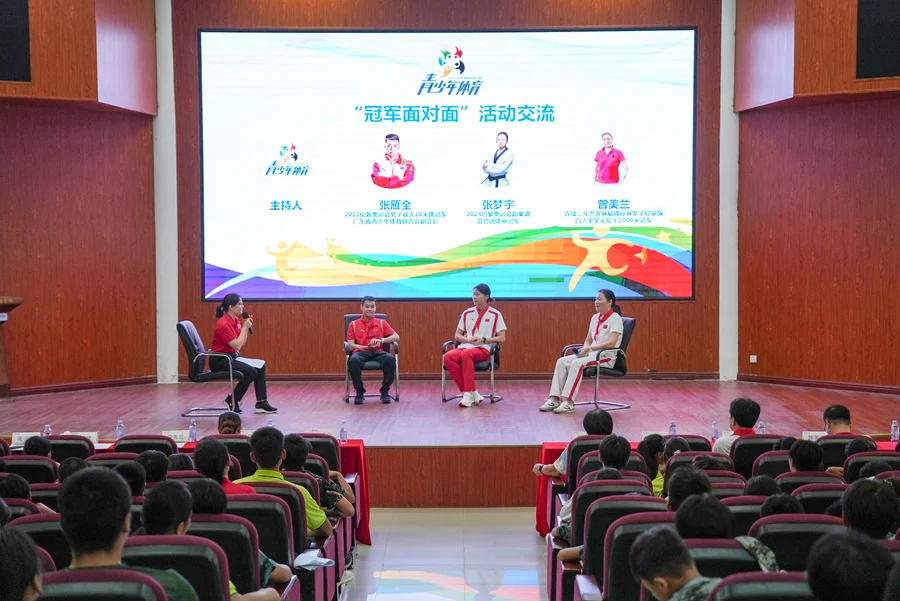 1988-1990 年連續(xù)三年世界賽艇錦標賽女子輕量級四人單槳無舵手2000米冠軍曾美蘭,2012年倫敦奧運會跳水冠軍、廣東省青少年體育聯(lián)合會副會長張雁全,2024年巴黎奧運會跆拳道混合團體賽(表演項目)金牌張夢宇等奧運冠軍來到現(xiàn)場,和學生們“面對面”,講述關(guān)于夢想、挑戰(zhàn)與超越的動人故事。